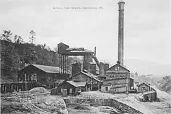 Once again, Gephart appeared on the scene to save the furnace. With the backing of Philadelphia and New York investors, he formed the Nittany Iron Company, which bought and rehabilitated the furnace, returning it to blast on June 5, 1902, under Frank H. Clemson (former chief of mining at Gephart's Bellefonte Furnace Company).[12] Other organizers included Lorenzo Terbal Munson, Gephart's brother-in-law (who was associated with Bellefonte Glass and the Bellefonte Iron and Nail Works), Archer Brown, and William Sampson.[13] However, prosperity did not return to the ironmaking business. The furnace was idle for two months in 1904. As steel production in open hearth furnaces became increasingly commonplace (a method better suited for iron made from Lake Superior ore, while Bessemer converters functioned best with Centre County ore), Nittany Furnace found it increasingly difficult to operate at a profit. The death of Gephart on February 14, 1905, also dealt a blow to the company, which thereafter shared management with the Bellefonte Furnace Company.