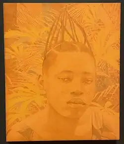 She uses photos she has taken herself in Nigeria along with family photos and pages from popular Nigerian magazines.[24] The photos "are layers in her work by collage and acetone-transfer prints, creating a fabric of images throughout her paintings".[25] Her primary mediums include collage, photo transfer, acrylic paint, charcoal, fabric, and colored pencil. Along with strong Nigerian influence, her style is also derived from pop culture, personal experience, and Western academia.[26] While creating, she thinks of her dual audience: American and Nigerian.[10] However, her work cannot be categorized as either American nor Nigerian, but rather the work is an autobiography based on her "character that doesn't fit into a box."[25]