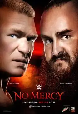 At SummerSlam, Brock Lesnar defeated Braun Strowman, Roman Reigns, and Samoa Joe in a fatal four-way match to retain the Universal Championship.[10] The following night on Raw, Lesnar's victory celebration with his advocate Paul Heyman was interrupted by Strowman, who attacked Lesnar with a Chokeslam and two Running Powerslams. Later on the show, a Universal Championship title match between the two was scheduled for No Mercy.[11] The following week, Lesnar and Heyman issued a warning to Strowman.[12] On the September 4 episode, after Strowman defeated Big Show in a Steel Cage match, Strowman also warned Lesnar before throwing Big Show through the cage.[13] In a confrontation the following week, Lesnar attacked Strowman with a German Suplex but Strowman quickly performed a Chokeslam and Running Powerslam on Lesnar, hoisting the title over Lesnar.[14] In a split-screen interview on the final Raw before No Mercy, Lesnar thanked Strowman for being a "great challenge", stating that is when he is at his best.[15]