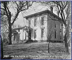 In 1868, Thomas Hartley Seymour of the Chicago Board of Trade purchased the house and surrounding land. He immediately added an Italianate style northern wing to accommodate his large family and servants. He also raised the roof on the older section, the south wing, to build a second floor. This also allowed for the implementation of round, arched windows. A small, wood frame summer kitchen was added to the south gable of the south wing. The family used the first floor of the former Noble house as a large dining room and they used the second floor as servants' quarters. To ensure architectural harmony with the newer section, a frieze was added to this wing below the roof.[3]