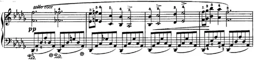 A sonorous foundation for the melodic line is provided by the widely spaced notes in the accompaniment, connected by the damper pedal. The waltz-like accompaniment gently emphasizes the 12