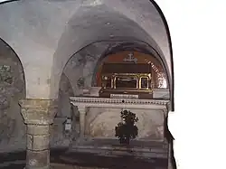 On the inside is a model frigate, made by an artisan watchmaker of the village in 1802 for Augustus Jacobsen. The church received the body of St. Philbert some time between 690 and 836, when he was transferred to Saint-Philbert-de-Grand-Lieu,[17] where the monks had taken refuge after the invasion of Normandy in 875. A shrine at the altar contains relics of the saint and was classified as a historical monument in 1898.