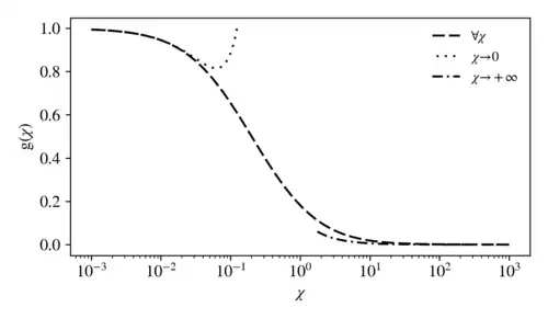 When the incoming field is very intense , the interaction of the electron with the electromagnetic field is completely equivalent to the interaction of the electron with multiple photons, with no need of explicitly quantize the electromagnetic field of the incoming low-energy radiation.[5] While the interaction with the radiation field, i.e. the emitted photon, is treated with perturbation theory: the probability of photon emission is evaluated considering the transition between the states of the electron in presence of the electromagnetic field.[5] This problem has been solved primarily in the case in which electric and magnetic fields are orthogonal and equal in magnitude (crossed field); in particular, the case of a plane electromagnetic wave has been considered.[8][5] Crossed fields represent in good approximation many existing fields so the found solution can be considered quite general.[5] The spectrum of non-linear inverse Compton scattering, obtained with this approach and valid for and , is:[28]