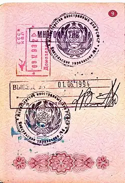 Some polities which restrict emigration require individuals to possess an exit visa to leave the polity.[2] These exit visas may be required for citizens, foreigners, or both, depending on the policies of the polity concerned. Unlike ordinary visas, exit visas are often seen as an illegitimate intrusion on individuals' right to freedom of movement. The imposition of an exit visa requirement may be seen to violate customary international law, as the right to leave any country is provided for in the Universal Declaration of Human Rights.