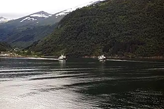 The fjord's mouth sits to the west between the village of Liabygda on the northern shore and mount Skrednakken on the southern shore. Further into the fjord, the villages of Eidsdal and Norddal lie along the southern shore, and their respective rivers. Eidsdal is connected to Linge on the northern shore by a ferry. A few kilometers east of Linge lies the village Sylte at the mouth of river Valldøla which runs through the large Valldalen valley.[7] Further east lies the tiny village of Fjøra, at the mouth of Tafjorden. The village of Tafjord lies at the end of the Tafjorden arm.