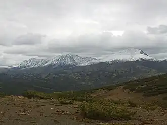 There are taiga forests of conifers, mostly larch, in the slopes of the mountains. At higher altitudes there is mountain tundra. Further up the mountaintops are either flat or topped by golets-type bare rocky summits.[2]
