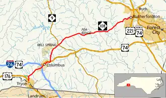 NC 108 begins at US 176 in Tryon and travels east through the unincorporated town of Lynn, where it crosses the Pacolet River. NC 108 has an interchange with Interstate 26 (I-26) and US 74 in Columbus, and another interchange with US 74 east of Columbus. NC 108 passes through the center of Columbus, the county seat of Polk County, which is the most developed portion of the route in Polk County. Three miles (4.8 km) east of the second US 74 interchange, NC 108 intersects NC 9 at the unincorporated town of Mill Spring. The section from Tryon to Mill Spring closely follows the front range of the Blue Ridge Mountains. It passes over the Green River in Polk County and the Broad River in Rutherford County. NC 108 ends at the intersection of South Main Street (carrying US 221 and US 74 Business west) and Charlotte Road (carrying US 74 Business east and US 221A) in Rutherfordton.[1]