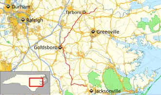 North Carolina Highway 111 (NC 111) is a 126.0-mile-long (202.8 km) primary state highway in the U.S. state of North Carolina. Traveling north–south through Eastern North Carolina, it connects the various rural towns and communities with the cities of Jacksonville (via U.S. Route 258 (US 258) and NC 24), Goldsboro and Tarboro.