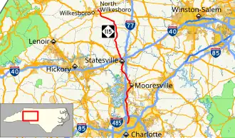 By 1933, NC 115 was extended north from the Iredell County-Wilkes County line to US 421 and NC 60 2 miles (3.2 km) east of Wilkesboro. The new section of NC 115 in Wilkes County was classified as a gravel, sand-clay, and topsoil roadway.[6] By 1940, NC 115 was completely paved between Statesville and Wilkesboro.[7][8] Within one year, the highway was extended north from its previous northern terminus to US 421 in North Wilkesboro. To accomplish this, NC 115 travelled along a brief concurrency with US 421 to the northwest. It then diverged from US 421 and travelled for approximately 1.4 miles (2.3 km) to NC 18 and NC 268. At the intersection, NC 115 turned southwest to run concurrently with the highways. Within North Wilkesboro, NC 115 used B Street and D Street as split streets between US 421 and Sixth Street. Sixth Street provided the connection for NC 115 between the two split streets.[9][10] By 1959, NC 115 was extended south to US 21 near Charlotte. The highway ran concurrently with US 21 for 13 miles (21 km) between Statesville and Shepards. the highway then travelled along its own routing through Mooresville, Davidson, and Huntersville. It ran in concurrency with US 21 or closely paralleled US 21 between its new southern terminus and Statesville.[11] On March 1, 1975, NC 115 was removed from its concurrency with NC 18 and NC 268 in North Wilkesboro and was truncated to its current northern terminus.[12] On August 26, 2003, northbound NC 115 was removed from Main Street between McClelland Street and Iredell Avenue, and Iredell Avenue between Main Street and Broad Street in Mooresville. The highway was rerouted to briefly follow McClelland Street between Main Street and Broad Street and then follow Broad Street to Iredell Avenue.[13]