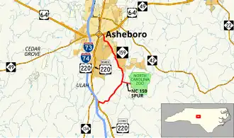 Established in 1975 as a new primary route, it went from the North Carolina Zoological Park to US 64/NC 49 in Asheboro. In 1977, its southern terminus was moved to connect to US 220, creating an NC 159 Spur to the park.[2]