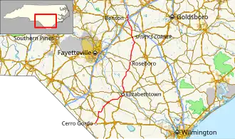 North Carolina Highway 242 (NC 242) is a primary state highway in the U.S. state of North Carolina. It traverses from Cerro Gordo to Benson, connecting the towns of Bladenboro, Elizabethtown, and Roseboro.