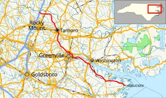 North Carolina Highway 33 (NC 33) is a primary state highway in the U.S. state of North Carolina. Spanning a distance of 110 miles (180 km), the east–west route passes through many small towns and communities in Eastern North Carolina's Inner Banks. It bypasses a large portion of the cities of Rocky Mount and Greenville, and goes through central Tarboro.