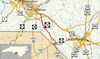 North Carolina Highway 381 (NC 381) is a primary state highway in the U.S. state of North Carolina. The highway connects the cities of Hamlet and Gibson.