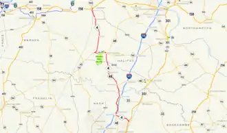 As North Carolina renumbered its state highways in 1934, NC 4 was commissioned as a short state highway, running only a few miles from US 158 to the community of Airlie, just south of Littleton.[3] When NC 48 running from Airlie to Littleton is rerouted to the east in 1951, NC 4 was left to take its place. In 1984 NC 4 was extended southward, taking over parts of NC 561, NC 48, and the decommissioned I-95 Business to US 301. I-95 Business was intended to take traffic from US 301 to I-95, and NC 4 took over that role.[2]