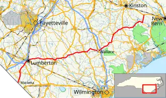 North Carolina Highway 41 (NC 41) is a primary state highway in the U.S. state of North Carolina. The highway travels in a north–south orientation between the South Carolina state line to Lumberton, then switches to an east–west orientation connecting the cities and towns of Elizabethtown, White Lake, Harrells, Wallace, Beulaville and Trenton.[1]