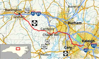 North Carolina Highway 54 (NC 54) is a 55.0-mile-long (88.5 km) primary state highway in the U.S. state of North Carolina. The highway serves the Research Triangle area, between Burlington and Raleigh, connecting the cities and towns of Chapel Hill, Durham, Morrisville and Cary. The highway also links the campuses of University of North Carolina at Chapel Hill and North Carolina State University.