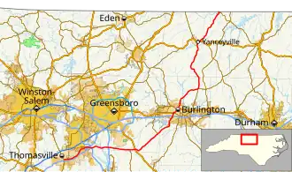| Alamance | Burlington | 41.4– 41.5 | 66.6– 66.8 | Exit 143 (I-40/I-85) | ||||