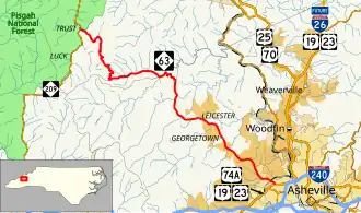 NC 63 is a 26.9-mile (43.3 km) two-lane mountain highway that begins at the community of Trust at NC 209. Going east, it stays along the north bank of the Friezeland Creek before climbing to its highest point at Doggett Gap. It quickly descends down 1,500 ft (460 m) to the mountain valley area below, in what can be described as aggressively twisty. Along the banks of Little Sandymush Creek, it passes through the community of Canto as it enters Buncombe County. After passing by Grassy Knob, NC 63 stops being a hard mountain highway, as it goes through Leicester and finally into Asheville, where it ends at Patton Avenue. Patton Avenue here carries U.S. Routes 19, 23, and 74A.[1]
