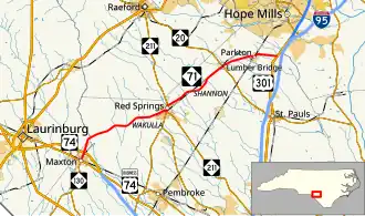 The southern terminus of the route is U.S. Route 74 Business (US 74 Bus.)[3] and Martin Luther King Drive in central Maxton. This point is also the western terminus of NC 130 from there the route follows North Patterson St to the US 74 / Future Interstate 74 interchange (exit 191 on US 74). Shortly after leaving town, the route has a brief incursion into Scotland County, it returns to Robeson County by crossing the Lumber River. After passing through the community of Wakulla, the route has a brief concurrency with NC 211 in the town of Red Springs. After the split from NC 211, NC 71 continues northeast to Shannon. To the north the highway serves Lumber Bridge, where it intersects NC 20, and Parkton. The northern terminus of the route is US 301, just outside Parkton.[1]