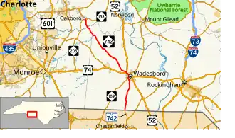 NC 742 was established in 1936 as a new primary routing from US 74 in Wadesboro to NC 205 in Oakboro.[2] Around 1947, NC 742 was extended south, over part of US 74 and NC 109, to the South Carolina state line, where it continues south as SC 742 (originally SC 850).[3] In 1996, the routings of US 52 and NC 742 were adjusted in Wadesboro; they were removed from Salisbury Street and onto a new road further west that crossed over the railroad tracks.[4]