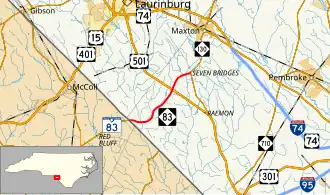 North Carolina Highway 83 (NC 83) is a primary state highway in the U.S. state of North Carolina. It serves to connect the towns of Maxton and Clio, South Carolina.