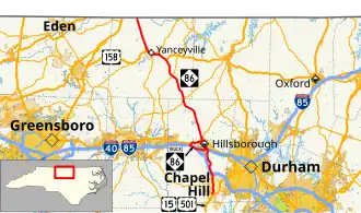 North Carolina Highway 86 (NC 86) is a primary state highway in the U.S. state of North Carolina that runs north and south through Orange and Caswell Counties from Chapel Hill to the Virginia state line at Danville, Virginia. The highway primarily links the towns of Chapel Hill, Hillsborough, and Yanceyville, along with providing a route between Chapel Hill and Virginia. Between Chapel Hill and Hillsborough, NC 86 parallels and serves as an alternative to I-40.