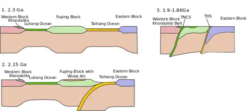 In the Paleoproterozoic time (2.5–1.6 billion years ago), the North China Craton amalgamated in three steps, with the final amalgamation took place 1.85 billion years ago.[5][9] Based on the metamorphic ages in the Trans North China Orogen, the assembly and the formation process of the North China Craton is determined.[5][9] Zhao proposed that the North China Craton was formed from 4 blocks, the Yinshan Block, the Ordos Block, the Longgang Block and the Langrim Block.[5][9] The Yinshan and Ordos Blocks collided and formed the Western Block, creating the Khondalite Belt 1.95 billion years ago.[5][9] For the Eastern Block, there was a rifting event in the Jiao-Liao-Ji Belt, which separated the Longgang Block and the Langrim Block with an ocean before the block was formed 2.1 to 1.9 billion years ago.[5][9] A rifting system is proposed because of how the rocks were metamorphosed in the belt and symmetrical rocks have been found on both side of the Belt.[5][9] Around 1.9 billion years ago, the rift system at the Jiao-Liao-Ji Belt switched to a subductional and collisional system.[5][9] The Longgang Block and the Langrim Block then combined, forming the Eastern Block.[5][9] 1.85 billion years ago, the Trans North China Orogen was formed by the collision of the Eastern and Western Blocks in an eastward subduction system, with probably an ocean between the 2 blocks subducted.[2][5][9][14]