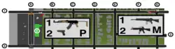 Phillips and Mătăsăreanu continued to engage the officers, firing sporadic bursts into the patrol cars that had been positioned on Laurel Canyon in front of the bank and in the parking lot across the street.[5] Officers, who were mostly armed with then-standard issue Beretta 92F/FS 9mm pistols, Smith & Wesson Model 15 .38 Special revolvers, and 12-gauge Ithaca Model 37 pump-action shotguns, continued to return fire at both robbers, but found their handguns and shotguns would not penetrate the body armor worn by Phillips and Mătăsăreanu. This was compounded by the fact that most of the LAPD officers' service pistols had insufficient power to be effective at the distances where most officers found themselves positioned relative to the bank entrance. An officer was heard on the LAPD police frequency approximately 10 to 15 minutes into the shootout, warning other officers that they should "not stop [the getaway vehicle], they've got automatic weapons, there's nothing we have that can stop them."[30] Additionally, the officers were pinned down by the heavy sprays of gunfire coming from the robbers, making it extremely difficult to attempt a head shot with their handguns. Several officers acquired five AR-15-style rifles from a nearby gun store to combat the robbers.[31][32][33][34]