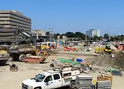 In February 2016, three bidders submitted proposals for mixed-use transit-oriented development to be built on the Hancock Street lot, with a new garage to replace lost parking spaces.[35] That April, the MBTA board approved a 99-year lease of the lot to a developer. The developer would build a 1,307-space garage, with 852 spaces reserved for MBTA parking, as part of the project.[36] The Quincy Planning Board approved the project, with the garage increased to 1,600 spaces, in June 2017.[37] Shortly before construction was expected to begin, a local carpenters union petitioned the state to force a public bidding process for the garage because it will be operated by the MBTA. In April 2018, Massachusetts Attorney General Maura Healey ruled that the MBTA or the developers were legally required to publicly bid for the garage construction.[38]