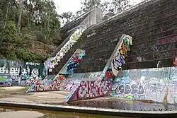 North Rocks was once considered as the haunt of convict bolters and bushrangers and regarded as an unsavoury area. One noted incident was the hold-up of Dr Sherwin in 1830 by John Macnamara and William Dalton, which resulted in the ex-convicts' demise.[4] The North Rocks were a massive sandstone outcrop, which terminated the ridge on the south side of Hunts Creek. These rocks so dominated the landscape and were such prominent features that they gave their name to the locality but were not preserved.[5] In 1841 when it was decided to build a new gaol at Parramatta, a contractor bought the Rocks as they consisted of the best sandstone in the district - and were very conveniently situated. His tender was accepted, and much of the North Rocks became gaol walls and flagstones in 1844. Further inroads were made on what was left when the wall of masonry was erected in 1855-56 which held back the waters of Lake Parramatta. Much stone was needed for the dam, as the wall is about 240 feet (73 m) long and is fifteen feet thick at the base.[6]
