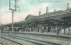 The main station building, a two-storey structure in the Italianate style, was located on the up side and consisted of a central block with two cross-wings.[30] The wings had gable roofs, whereas the central part had a low-pitched hipped roof.[30] Two standard L&NWR signal cabins were positioned to the north and south of the platforms, these being known respectively as Northampton No. 1 and No. 2 boxes.[30] Other signal cabins, Northampton No. 3 and No. 4, were sited further north and controlled extensive marshalling yards.[30] A fifth cabin at Duston West Junction lay to the south-west; it controlled the apex of the Northampton triangle.[30] No. 2 was the largest signal cabin with 118 levers which controlled the country end of the station, access to the goods shed and the south end of the goods yard.[31]
