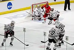 The Northeastern Huskies men's ice hockey team is an NCAA Division I college ice hockey program that represents Northeastern University in Boston, Massachusetts. The team has competed in Hockey East since 1984 and has won three tournament titles, having previously played in the Eastern College Athletic Conference (ECAC), where they won one tournament championship. The Huskies play home games at the 4,666-seat Matthews Arena, the world's oldest hockey arena still in use.[2] Jerry Keefe assumed the head coach role in 2021 after longtime coach Jim Madigan moved to athletic director.[3]