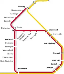 - Central (Grand Concourse), then Burwood, Strathfield, Rhodes, Meadowbank, West Ryde, Eastwood, Epping, and then all stations to Hornsby.