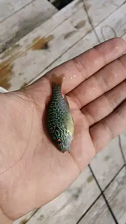 - ^ Jean Porterfield; Patrick Ceas (2021). Life histories of the northern longear sunfish (Lepomis megalotis peltastes) and pugnose shiner (Notropis anogenus) in Minnesota, with examinations of other rare non-game fishes (PDF) (Report). Minnesota Department of Natural Resources. Retrieved 2024-08-27.