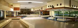 The main part of the school began construction in 1963, opening for the 1966–67 school year on September 7, 1966. A few years later, the L wing began construction and opened for the 1969–70 school year on September 3, 1969. A unique feature of the school building is the large open area, called the Commons, that visitors enter into immediately from the main entrance. The Commons acts as a hub for the entire school. Both the large and small cafeteria, faculty dining room, library and auditorium are located directly off the Commons, from which students may visit The Tiger's Den (school store) and access almost all of the schools wings. There is a balcony on the north side, providing access to the school's administrative offices and counseling center. The Commons is also a favorite hangout of NHS students who congregate there before and after school, during lunch and free periods. In each corner lies the "wells," partially enclosed recessed areas where students can catch up on work, socialize or relax. The largest well has been designated for the senior class through decades of tradition, leaving the two smaller wells for the junior and sophomore classes. As part of an extensive grade restructuring of the entire Northport-East Northport Union Free School District in 1988, the 9th grade was reassigned from each of the junior high schools (as they were called at the time) to the high school. This created two incoming classes that year, including freshmen for the first time.[7] Since there was no existing well for the new freshman class and one could not be constructed, the high school built the freshman benches instead.