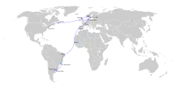 On 2 March 1938, the board of DNL decided to sell Valkyrien to Chargeurs Reunis and abandon plans for intercontinental traffic. Instead, negotiations started with Aer Rianta of Ireland, who were cooperating with Pan Am on the transatlantic route; DNL, DDL, Aero and Aerotransport planned to start a route from Foynes via Stavanger, Oslo and Stockholm to Moscow.[15] However, Pan Am decided to move the route to the Azores when it commenced in 1939 and DNL's Shannon-plans were terminated. Following this, the Nordic airlines started negotiating the possibility of cooperating on their own transatlantic route via Iceland and Newfoundland. In 1940, a delegation was sent to the United States, where it negotiated the necessary permissions from the American authorities and purchase rights for aircraft. After the break-out of World War II, the United States had become more interested in a northern transatlantic route, so it could reach the neutral Scandinavian countries.[16]