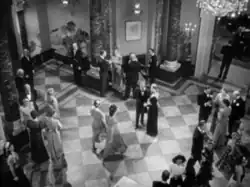 Roger Ebert described Notorious as having "some of the most effective camera shots in his—or anyone's—work".[34] Hitchcock played off Grant's star power in his first scene, introducing his character with shots of the back of the actor's head showing him observing Alicia carefully. The excess of her drinking is reinforced the next morning with a close-up and zoom out from a glass of fizzing aspirin beside her bed. The camera switches to her point of view and the viewer sees Grant as Devlin, backlit and upside down.[34] The film also contains a tracking shot at Sebastian's mansion in Rio de Janeiro: starting high above the entrance hall, the camera tracks all the way down to Alicia's hand, showing her nervously twisting the key there.[34][35]