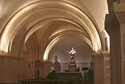 Following the death of Espérandieu on September 11, 1874, Henri Révoil was charged with finishing the interior of the basilica, in particular the mosaics. The construction of the major crypt and installation of the mosaics in the choir was carried out in 1882. Unfortunately a fire on June 5, 1884, destroyed the altar and the mosaic in the choir; moreover the statue of the Virgin was damaged. The statue and the mosaics were restored and the altar was rebuilt according to the drawings of Révoil. On April 26, 1886, cardinal Charles Lavigerie consecrated the new crypt.[59] In 1886, walnut stalls were built in the choir; the last mosaics in the side vaults were finished between 1887 and 1892. In 1897, the two bronze doors of the upper church and the mosaic above them were installed and the statue of the Virgin was regilded for the first time. Final completion of the basilica thus took place more than forty years after the first stone was laid.