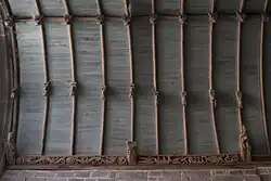 Above the large arches, the wall rises to the base of the dado in the barrel vault, which rises to a height of 11m. high. All that remains of the orthogonal molding that once adorned the wall are traces of woodcutting. On the other side of the arcades, the aisles, which are less high than the nave, are covered by a low barrel vault. The vault is supported on the nave side by a wall plate, which supports the corbels.[19]