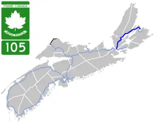Highway 105 in Nova Scotia represents the Cape Breton Island leg of the Trans-Canada Highway. It runs from the Port Hastings Rotary just east of the Canso Causeway in Port Hastings to the Marine Atlantic ferry terminal in North Sydney, representing a distance of 142 kilometres (88 mi).[1]