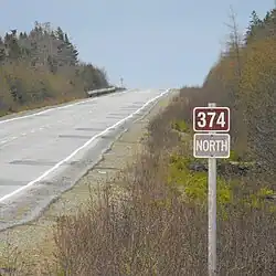 Route 374 is a collector road in the Canadian province of Nova Scotia. It connects New Glasgow at Exit 24 of Nova Scotia’s Highway 104 with Sheet Harbour at Trunk 7. The highway runs through the Halifax Regional Municipality, Guysborough County & Pictou County.