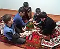 The decoration of the festive table is known as khoncha. A large silver or copper tray with samani – green shoots from wheat seeds – is placed in the centre and candles and dyed eggs. Custom dictates that the table should be set with at least seven dishes.[4]