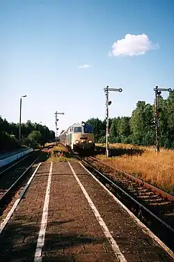After 1989, the economic system change led to a significant reduction in coal transport, making Nowa Wieś Wielka–Gdynia Port railway no longer necessary for handling excess traffic. On 30 August 1990, the last scheduled fast train on the Gdynia–Wrocław route passed through Kościerzyna.[40] From 1991, the line was used exclusively for limited freight transport to Gdynia and on the Chojnice–Bydgoszcz route. Additionally, trains carrying oversized cargo appeared occasionally. Local passenger traffic remained largely unchanged.[39]