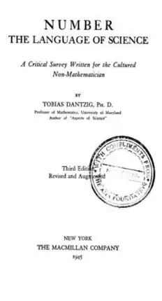 Number: The Language of Science: A Critical Survey Written for the Cultured Non-Mathematician is a popular mathematics book by Tobias Dantzig. The original U.S. publication was by Macmillan in 1930.[1] A second edition (third impression) was published in 1947 in Prague by Melantrich Company. The book recounts the history of mathematical ideas.[2]