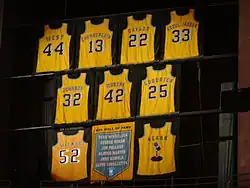 Los Angeles Lakers retired numbers displayed at the Staples Center (now known as Crypto.com Arena) in 2013