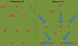 In a more modern 4–2–3–1 system, the numbering will typically be arranged like this:
