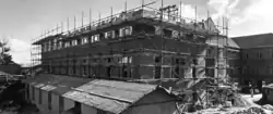 Construction of the northern wing by day labour commenced after the former head teacher's residence, which stood on the building site, was sold for removal.[68][69] The hip-roofed wing, aligned east–west and perpendicular to Bage Street, consisted of two storeys above an undercroft. Each floor comprised four classrooms for 40 pupils, a cloakroom and connecting corridors. By means of folding partitions each floor of this wing could be converted into one large room. One classroom on the first floor was raised 600 millimetres (24 in) to form a stage. The undercroft comprised lavatory accommodation for girls and female teachers and a concreted play area. The building's estimated cost was £9,890.[68][70][71][72][73][74] Temporary brick walls with lime mortar and a fibrous-cement gable infill were constructed where the range was to be connected.[75][1]