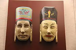 The number of masks used in one drama ranges from several dozen to two hundred. There are five kinds of masks used in Nuo Drama, namely: civilian general, military general, old general, young general and woman general with other minor roles such as soldiers and Taoist monks.[3] Each nuo mask has a fixed name, represents a certain role and has legendary stories to tell of its origins. In Guizhou, a province with the largest nuo drama repertoire, at least 24 masks are required to perform an entire nuo drama piece. The masks can appear valiant and martial, stern and tough, or gentle and kind, and they come in various styles to represent different figures. For instance, since the responsibility of valiant gods is to emit awe and dispel ghosts and devils, their masks usually have horns and buckteeth, with a very ferocious countenance.[15]