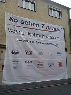 Postcard of the Citizen Initiative Das bessere Bahnkonzept (The better railway concept) against the new line (1994)Protest banner in Bamberg against the planned noise barriers