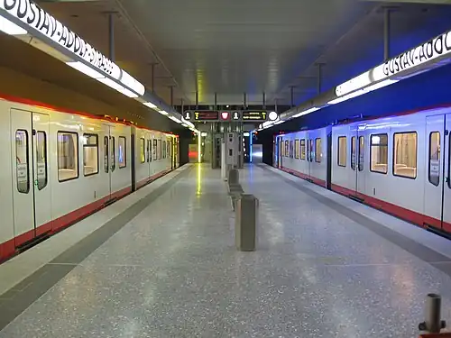 On 1 March 1972, the first 3.7-kilometre (2.3 mi) stretch of the system opened, U1 Langwasser Süd to Bauernfeindstraße.[6] An elevated line from Muggenhof station to Stadtgrenze station started construction along with the works on the first stretch of U1 in the Southeast of Nuremberg. This line along Fürther Straße would be used on an interim basis for the Straßenbahn (Tram) from 1970 to 1981 before being opened for the U-Bahn in 1982.[7][8] Over the next few years, further stretches of U1 were opened. Uniquely, the metro was built "from the outside in", starting in the rather outlying area of Langwasser before reaching the historical core and the central train station. Langwasser was a new housing development with many high-rise buildings assembled from prefabricated parts as was the style in that era. Similar developments in East Germany are known as Plattenbau. When Plärrer station was built, it was built with two sets of tracks above each other and provisions were made for another level of tracks to cross the existing tracks. The former has been in use for U2 (and later U3) ever since those lines opened, whereas the latter has never been fully built up as of 2024. Unlike at Hauptbahnhof where U2/U3 and U1 stop on different levels, at Plärrer there is one track on both levels used for U1 and the other for U2/U3, enabling easier change between trains (Cross-platform interchange). The first subway line reached Fürth Hauptbahnhof in 1985 which would remain its endpoint until 1998. The focus thus shifted to the construction of a second subway line in Nuremberg.